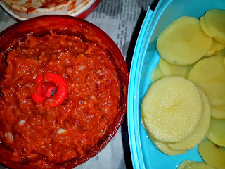 Bahan2 menumis, cili giling, bawang putih dan bawang merah / bawang besar... Wife aku guna gadget tupperware dia. Dalam bekas biru ubi kentang yang dipotong nipis...