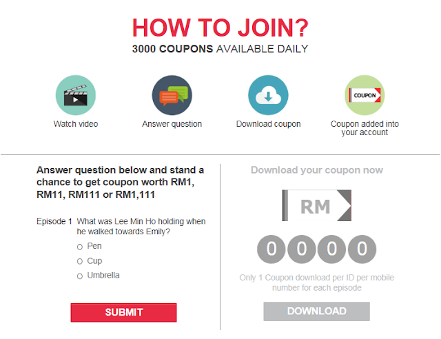 Love at first sight episode yang ditayangkan mulai 24th May - 30th May 2015. So korang ada masa lagi 3 hari untuk menang kupon RM 1, RM 11, RM 111 dan RM 1,111. Apalagi standby esok yer pukul 9.00 pagi terus watch this episode and answer 1 easy question as following.